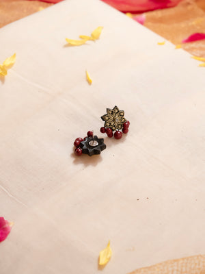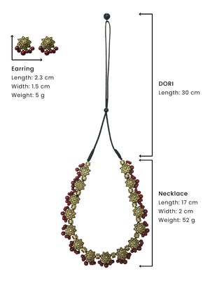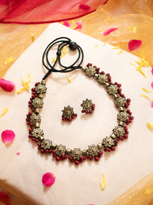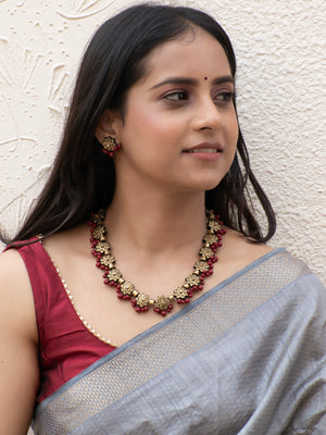 Kundanjali — Antique Gold Floral Tube Design Maroon Kundan Stone Handmade Terracotta Necklace Set