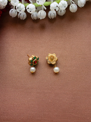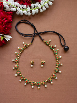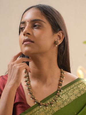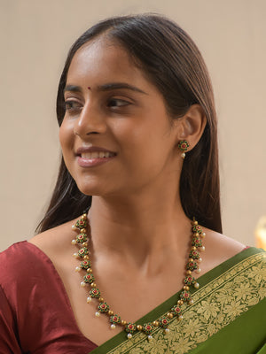 Antique Gold Green and Red Flower Design Handmade Terracotta Necklace Set with Pearls
