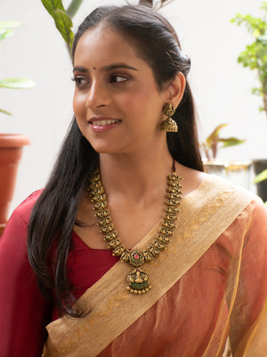Antique Gold Green Pink Lakshmi Peacock Design Handmade Terracotta Necklace Set