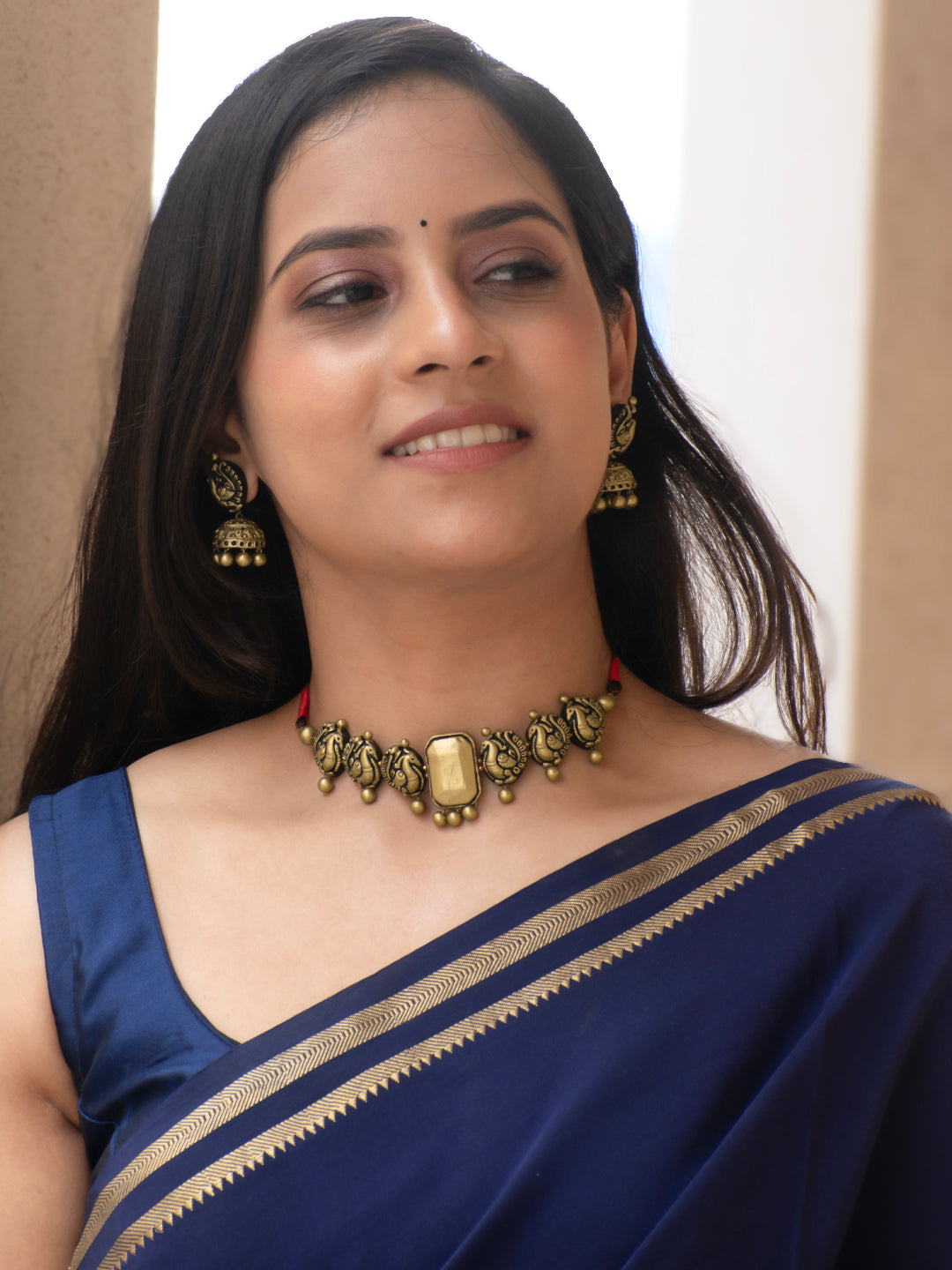 Antique Gold Peacock Design Rectangular Victorian Choker Handmade Terracotta Necklace Set