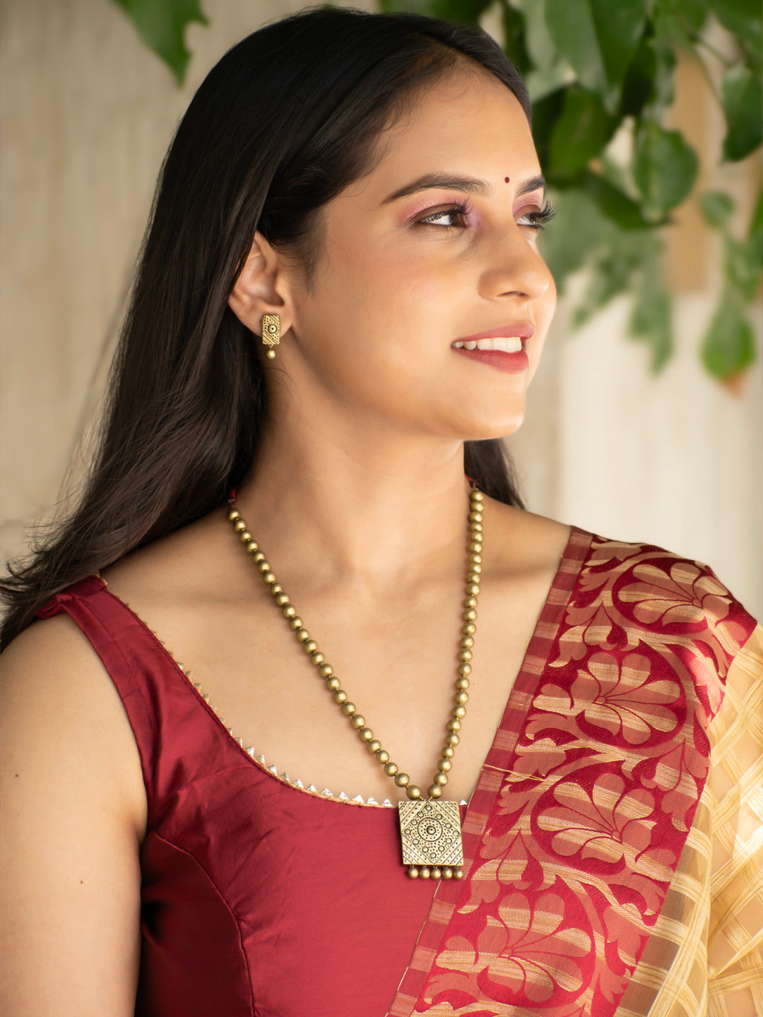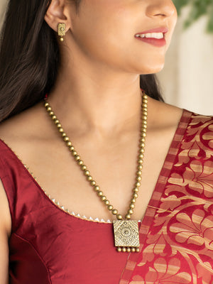 Antique Gold Rectangular Pendant Rhombus and Circlular Art Work Handmade Terracotta Necklace Set