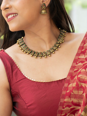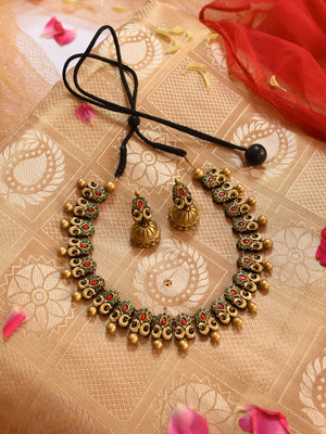 Antique Gold Red Green Floral Peacock Design Handmade Terracotta Necklace Set