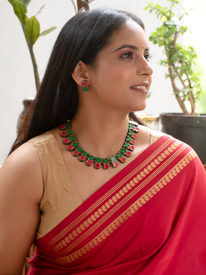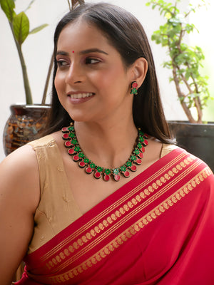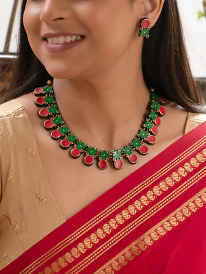 Antique Gold Red Green Geometric Design Handmade Terracotta Necklace Set