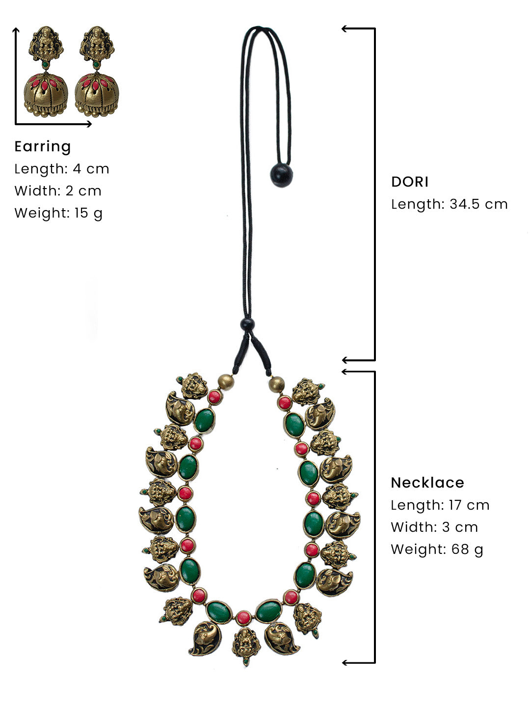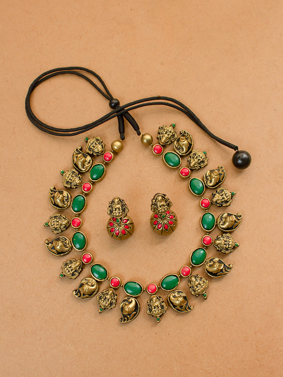 Antique Gold Red Green Lakshmi and Elephant Design Handmade Terracotta Necklace Set