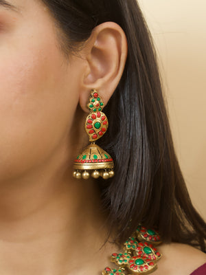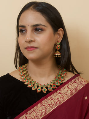 Antique Gold Red Green Mango Design Temple Handmade Terracotta Necklace Set
