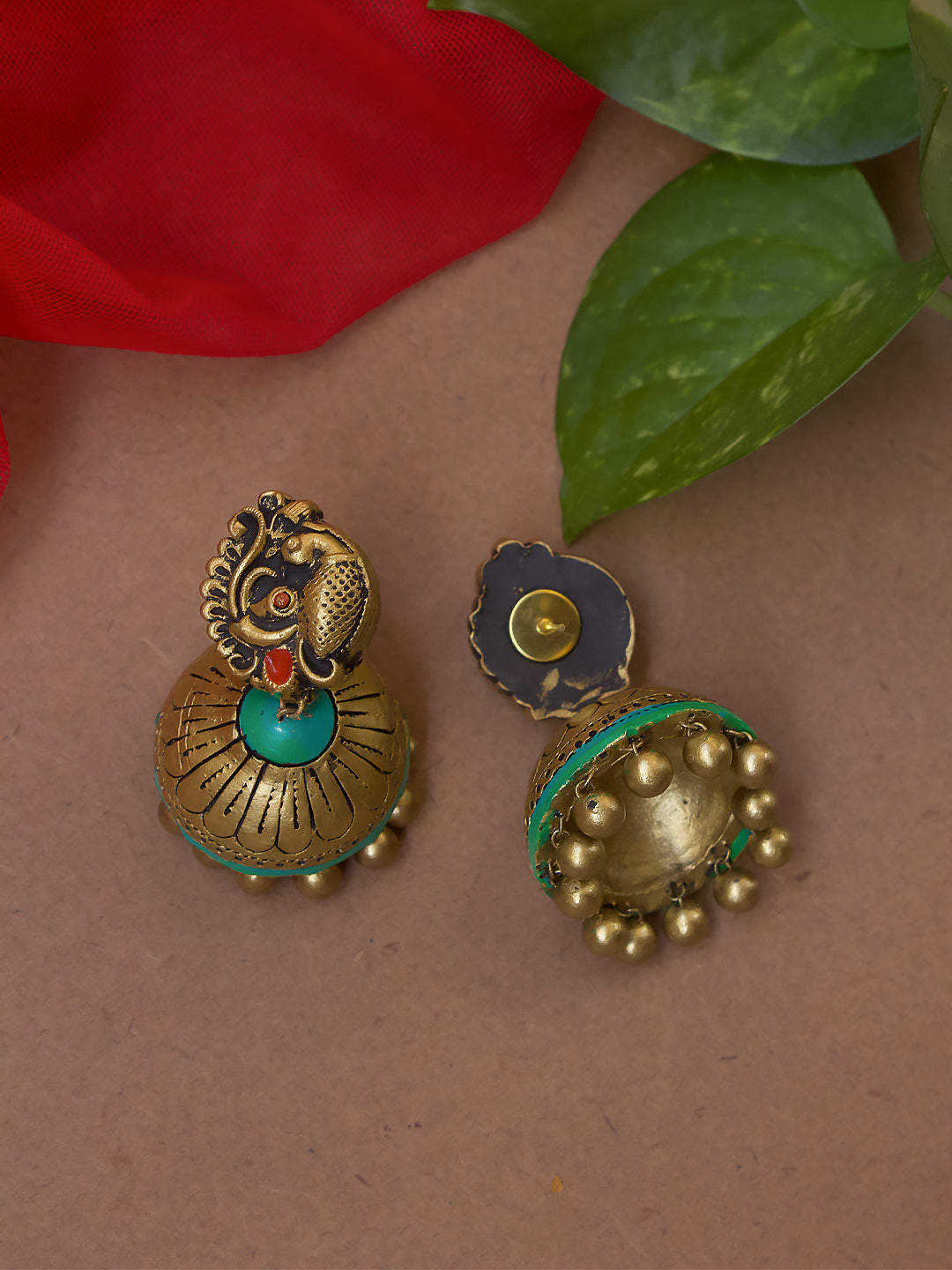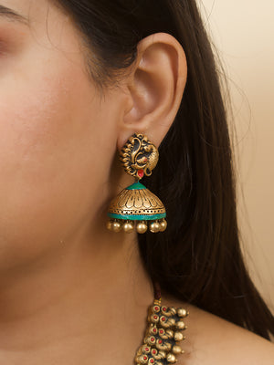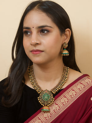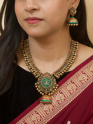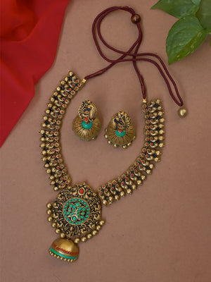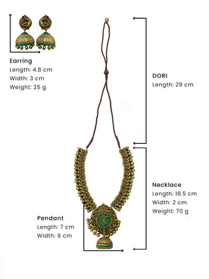 Antique Gold Red Green Pear Shape Jhumka Pendant Fringe Pattern Lakshmi Peacock Design Handmade Terracotta Necklace Set