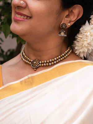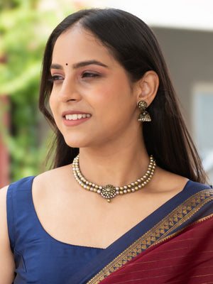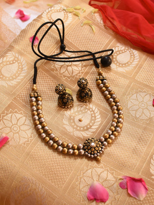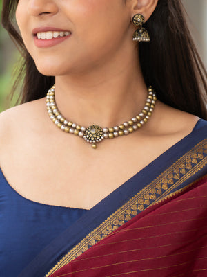 Antique Gold Silver Two Layered Floral Pendant Handmade Terracotta Victorian Choker Necklace Set