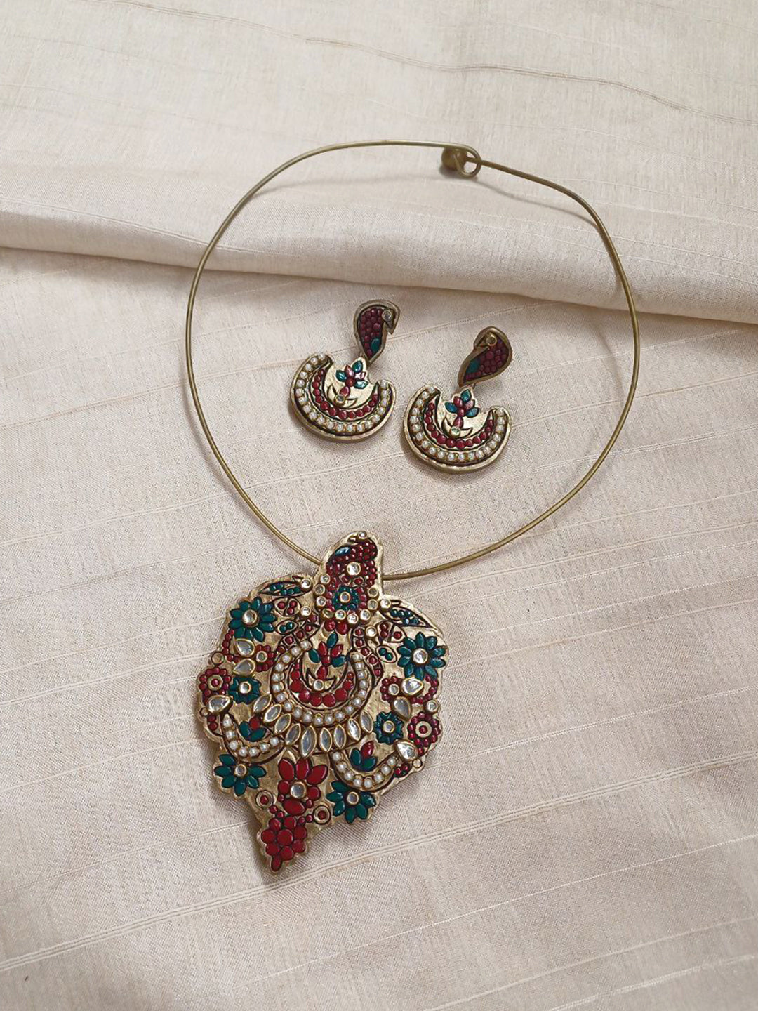 Home Antique Regal Terracotta Choker Set with Crescent Earrings – Gold, Red & Green Earrings