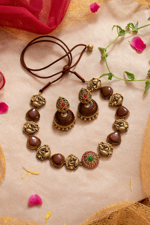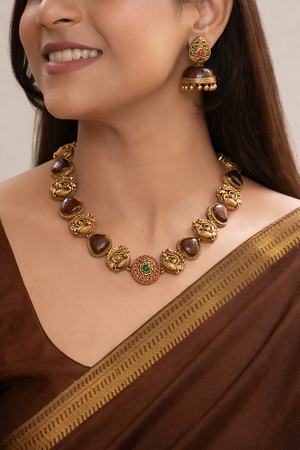 AurumDhara 🤎 — Brown Terracotta Statement Necklace Set with Antique Gold Peacock Motifs & Heritage Jhumkas