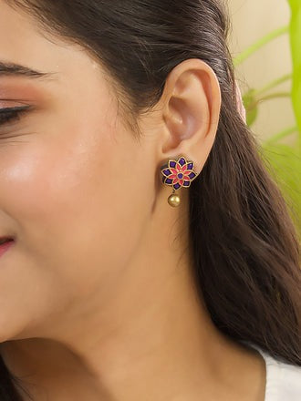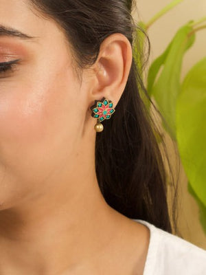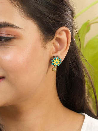 Home Bamboo Yellow Aqua Blue Antique Gold Floral Mandala Work Handmade Terracotta Stud Earrings (Copy)