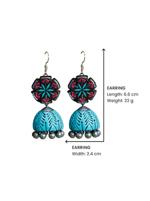 Mandal Art Work Handmade Terracotta Jhumka Earrings in Light Blue Antique Silver and Pink