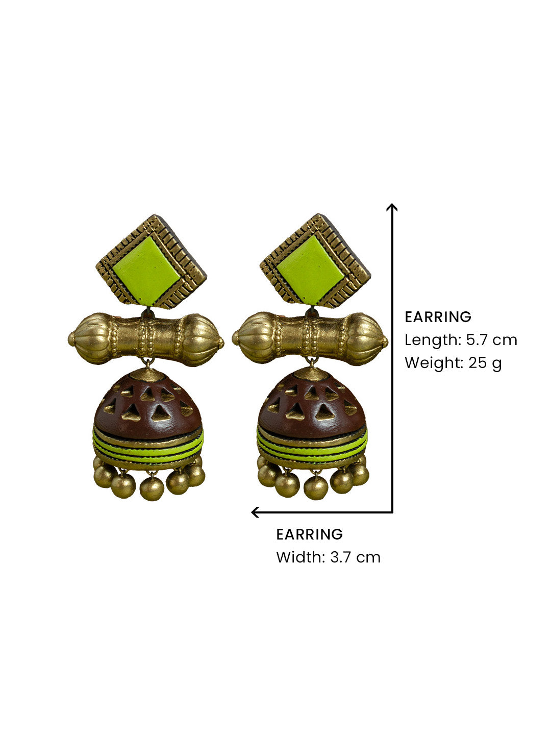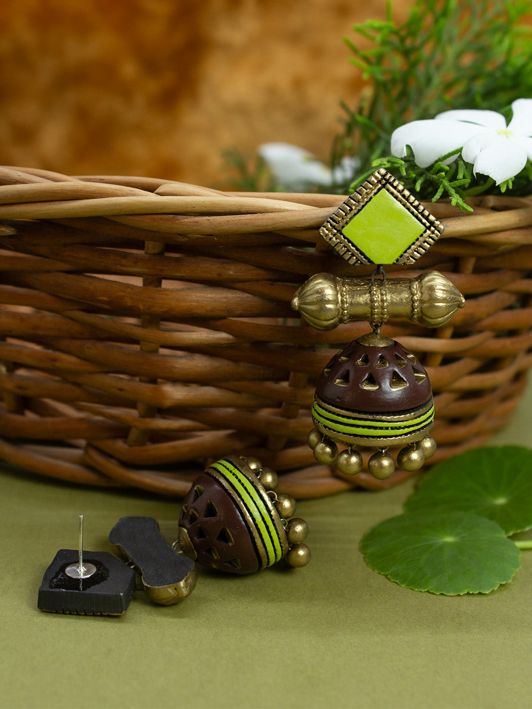 Handmade Terracotta Jhumka Earrings in Antique Gold Brown Green