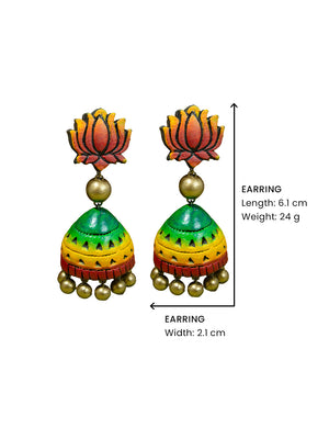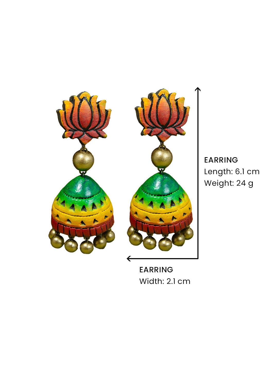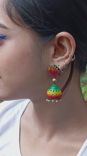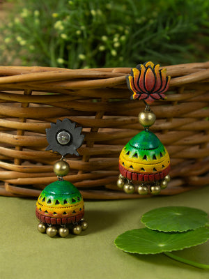 Lotus Design Handmade Terracotta Antique Gold Yellow Maroon Green Jhumka Earring