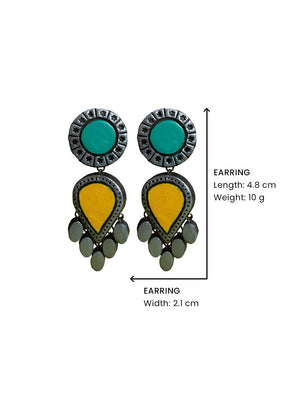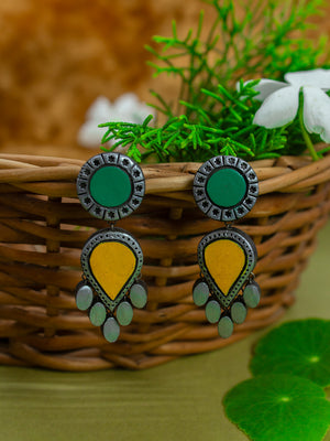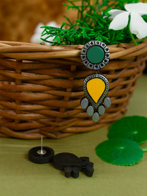 Emerald Green Yellow Antique Silver Leaf Design Handmade Terracotta Drop Earrings