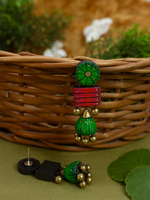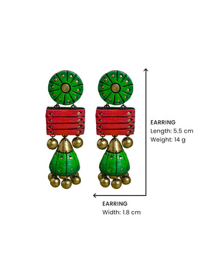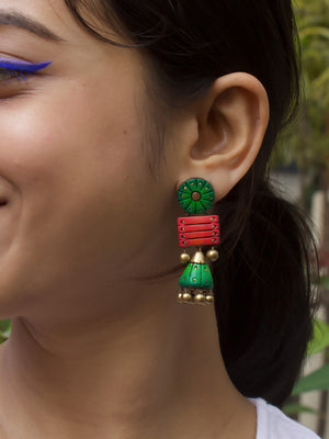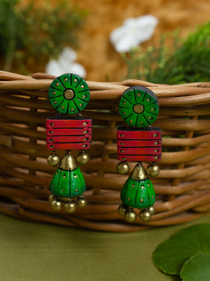 Circular and Square Design Green Pink Antique Gold Handmade Terracotta Stud Jhumka Earrings