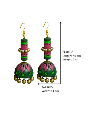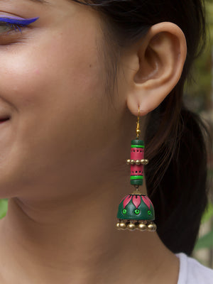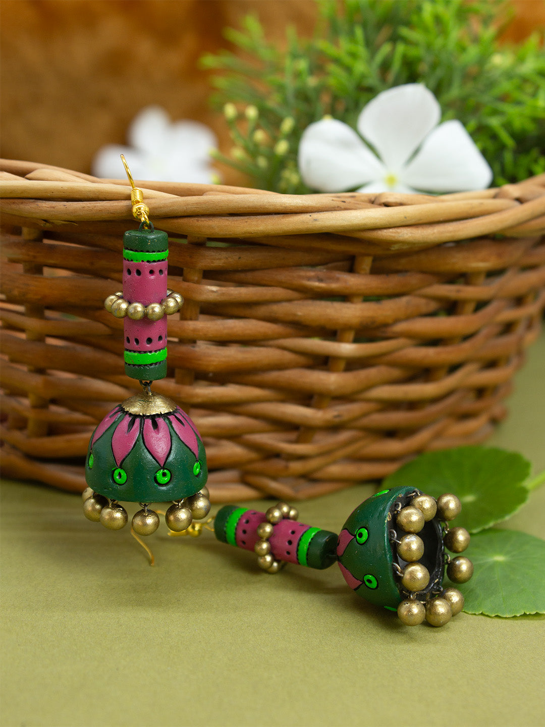 Bohemian Style Gold Rose and Green Colour Handmade Terracotta Jhumka Earrings