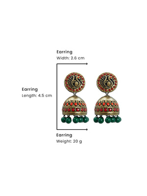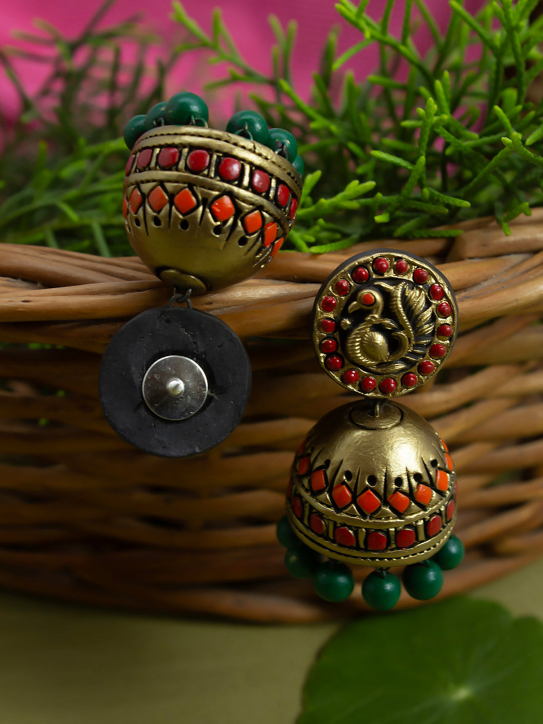 Home Antique Gold Red Green Circular Peacock Design Disc Handmade Terracotta Stud Jhumka Earrings