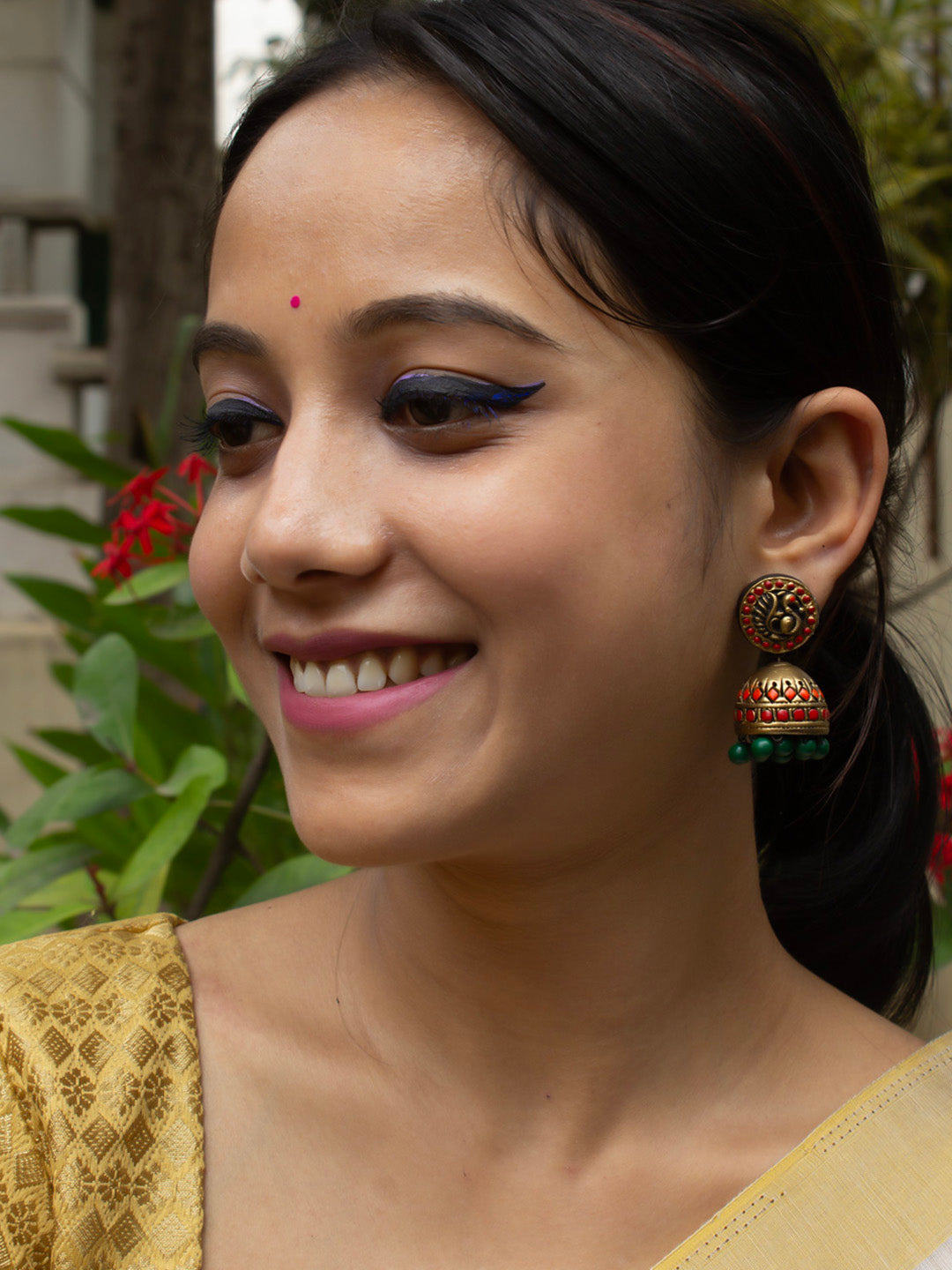 Antique Gold Red Green Circular Peacock Design Disc Handmade Terracotta Stud Jhumka Earrings