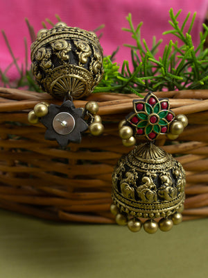 Home Priyanka — Antique Gold Red Green Mandala Art Design Peacock Handmade Terracotta Stud Jhumka Earrings