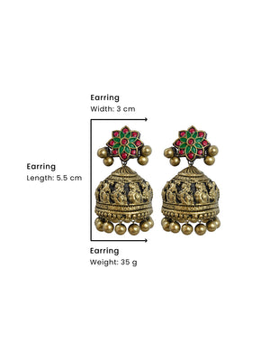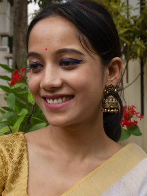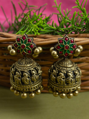 Priyanka — Antique Gold Red Green Mandala Art Design Peacock Handmade Terracotta Stud Jhumka Earrings