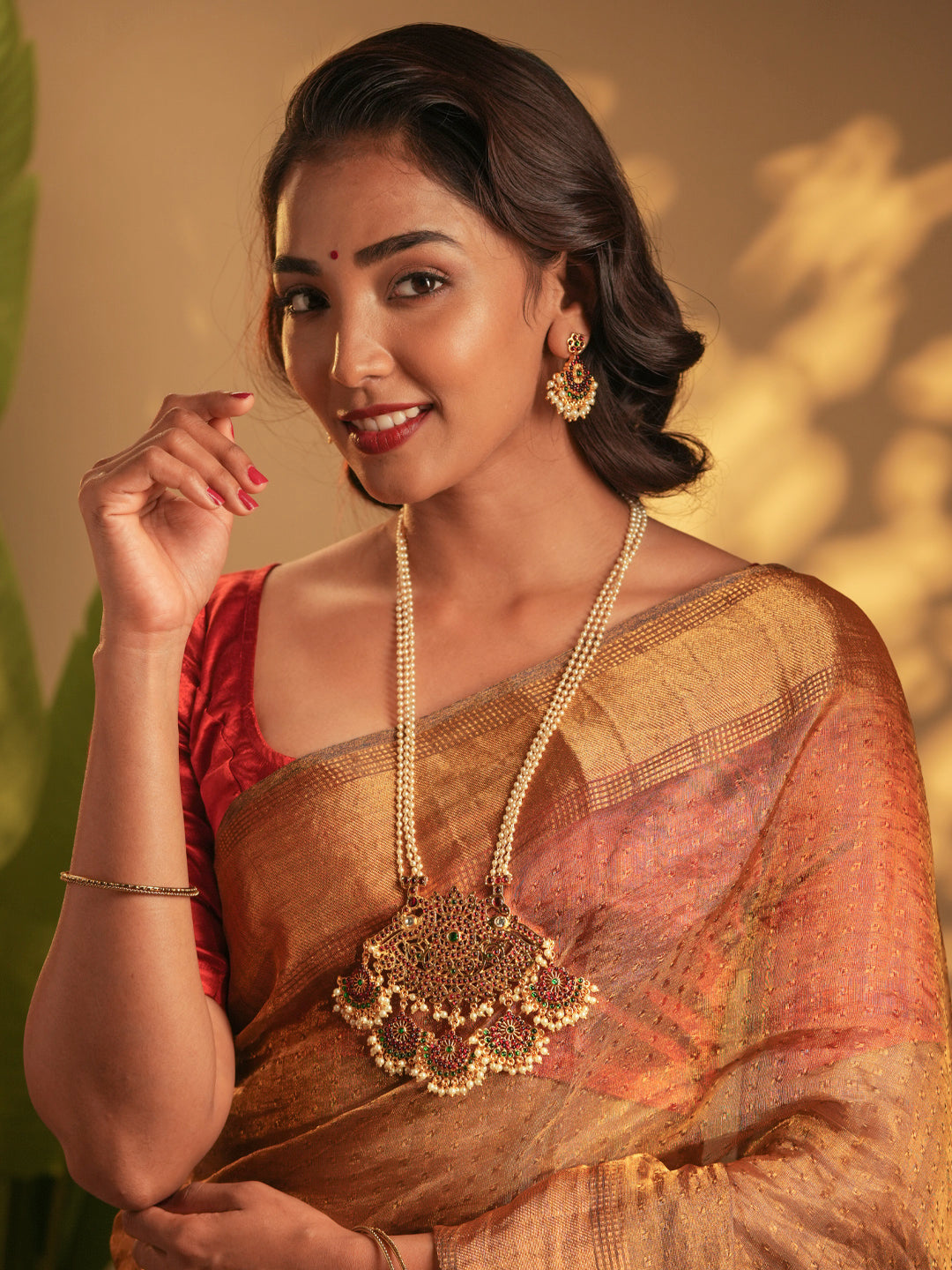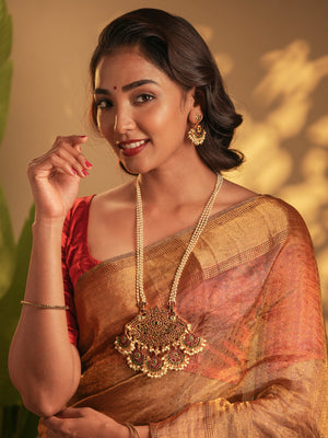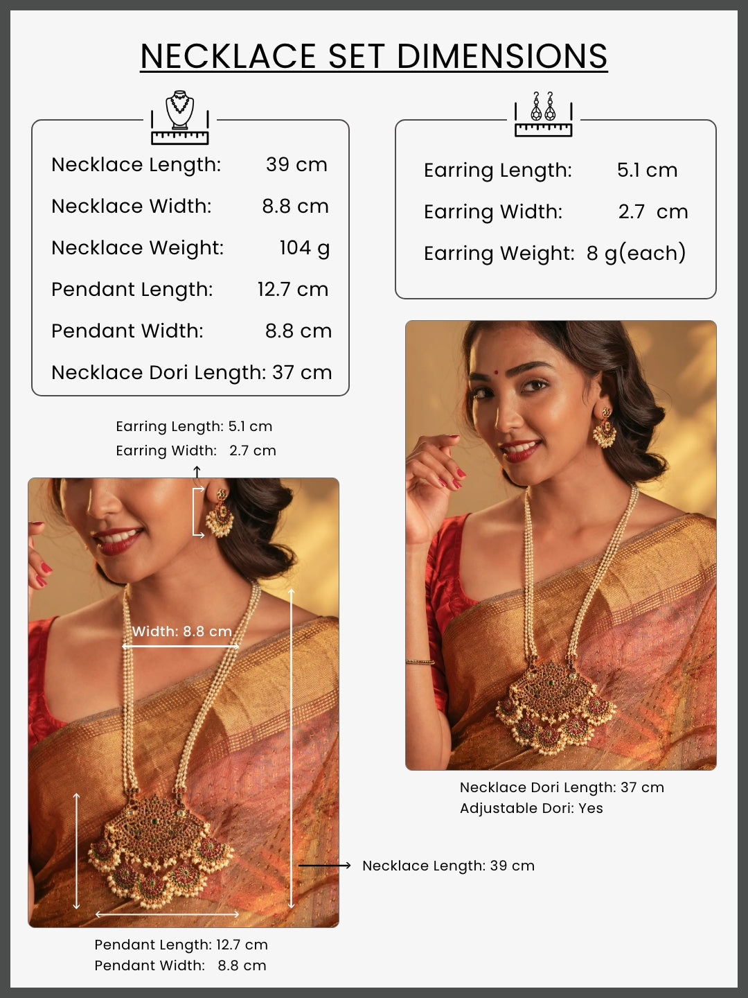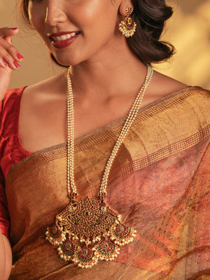 Gold Tone Temple Necklace Set- Pearl Haaram Red