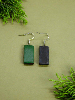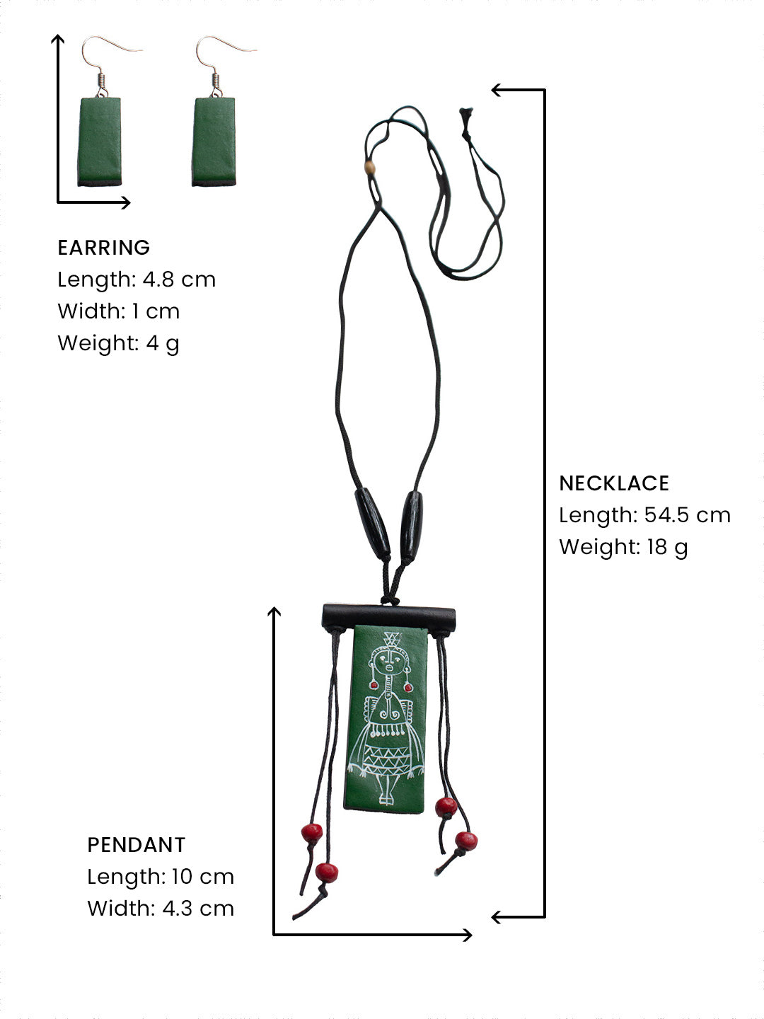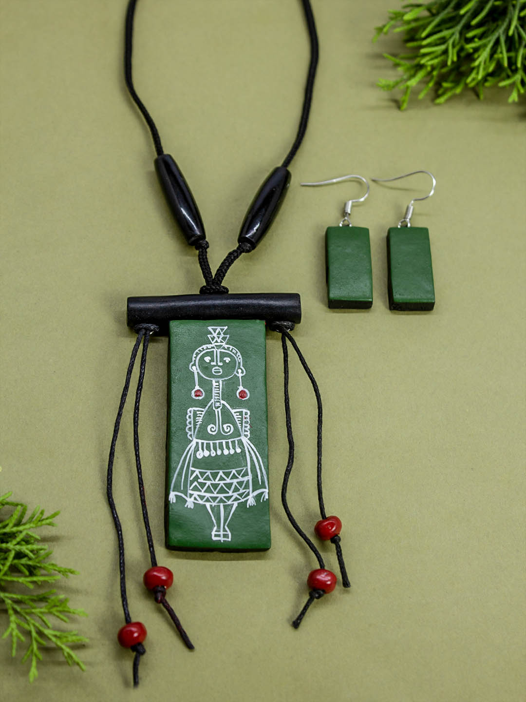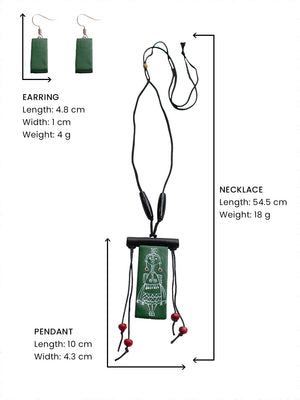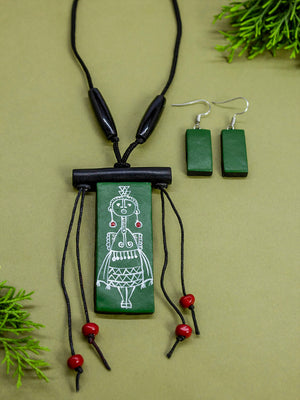Green White Rectangular Shape Folk Art Warli Art Painting Handmade Terracotta Necklace Set