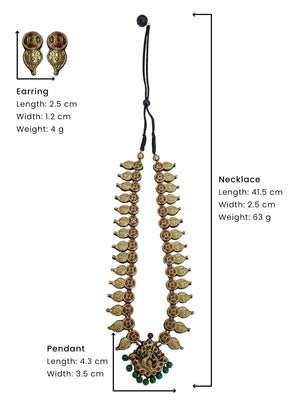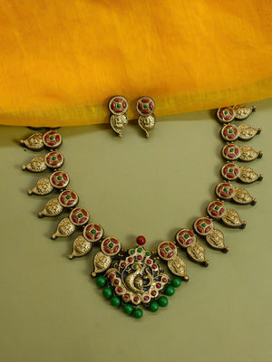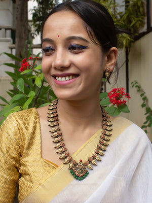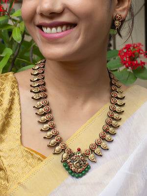 Lakshmi Coin Leaf Peacock Design Antique Gold Red Green Long Haram Handmade Terracotta Temple Necklace Set