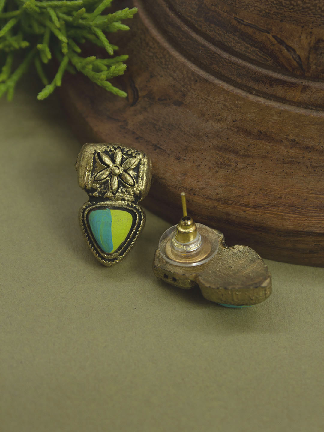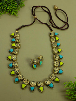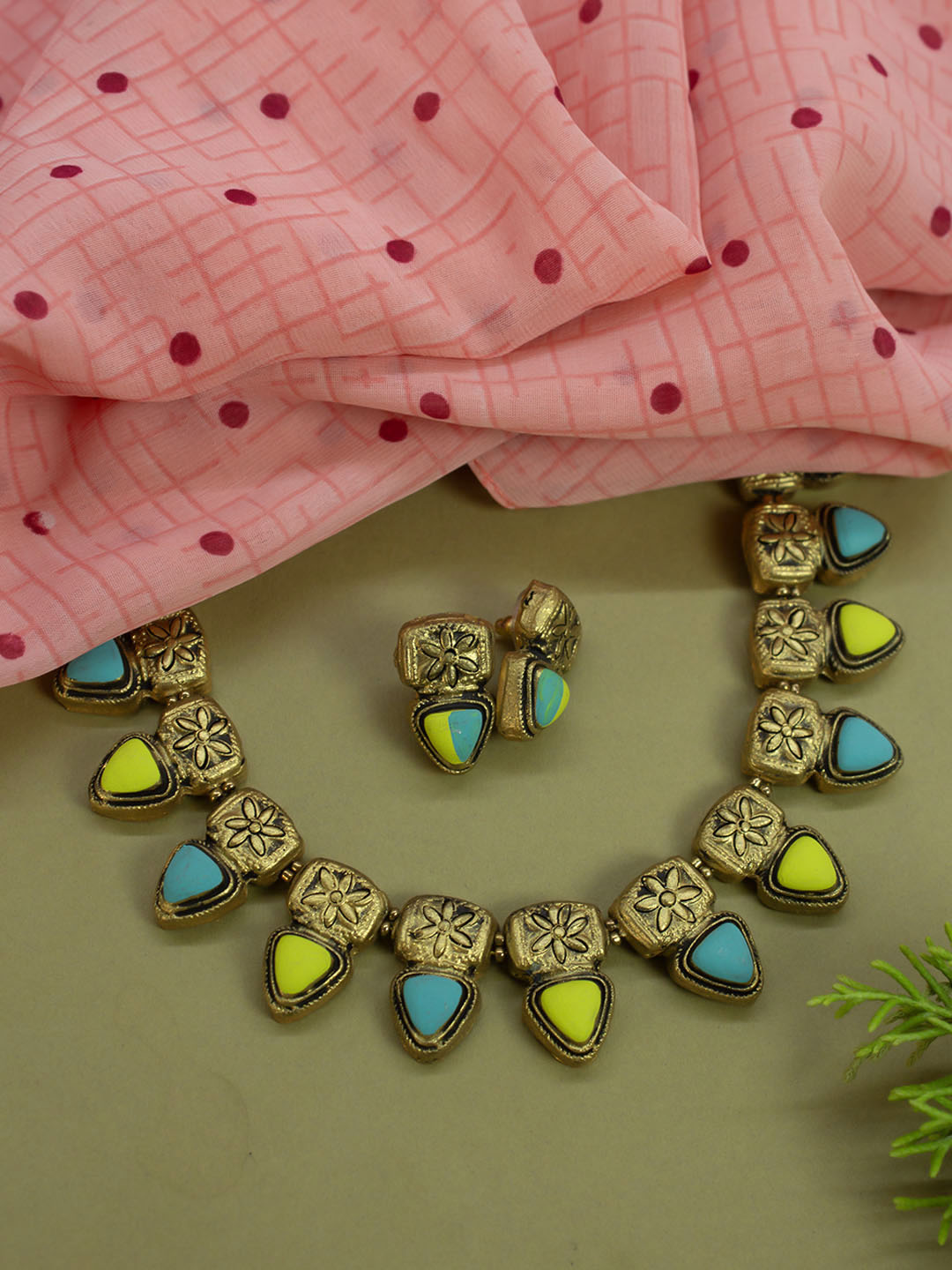 Antique Gold Leaf Green Aqua Blue Triangular Shape Minimalistic Mandala Design Handmade Terracotta Necklace Set