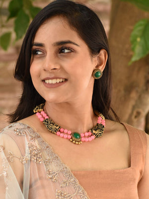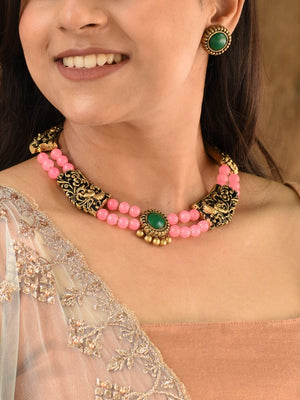 Home Chandralekha — 2 Layered Rani Haar Design Pink Glass Beads Peacock Design Antique Gold Green Handmade Terracotta Necklace Set