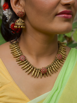 Antique Gold Pink Floral Engrossed Fringe Design Handmade Terracotta Necklace Set