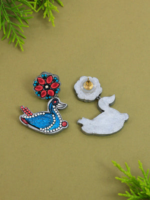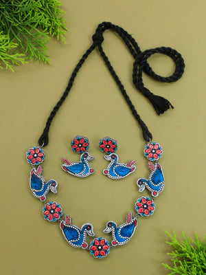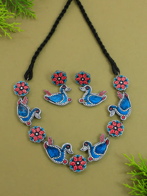 Bird and Flower Design Pink Blue Silver Minimalistic Handmade Terracotta Necklace Set
