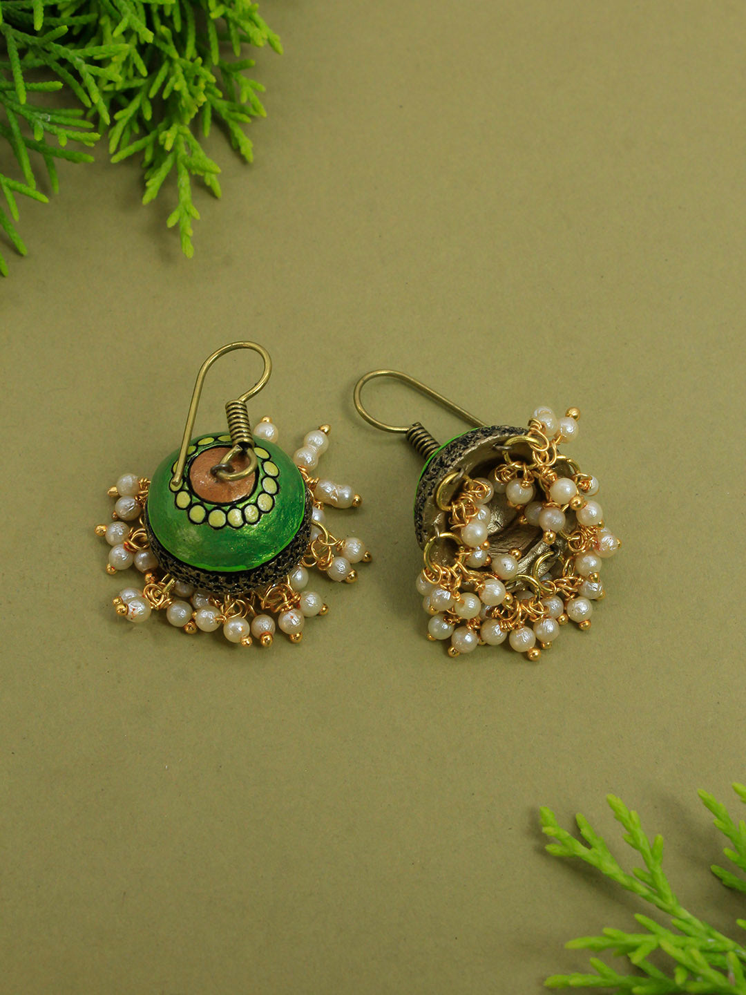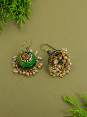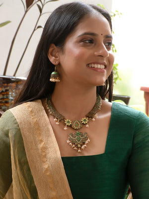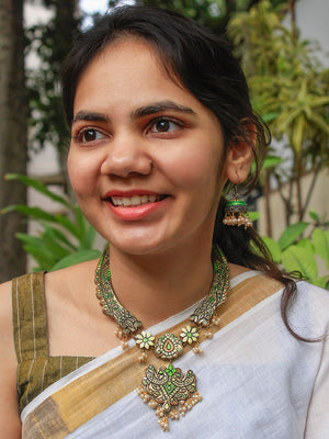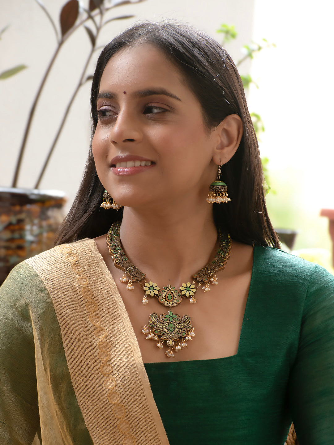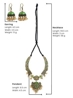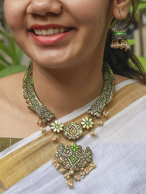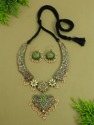 Mandala Art Design Green Yellow Antique Bronze Handmade Terracotta Necklace Set