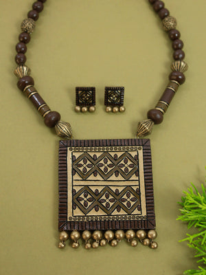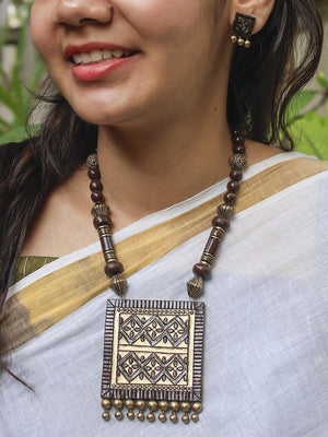 Home Mandala Art Work Antique Bronze Square Pendant Mala Handmade Terracotta Necklace Set