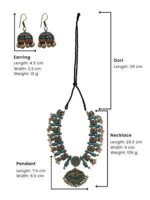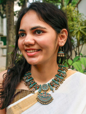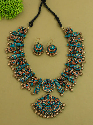 Mandala Art Design Peacock Gold Blue Turquoise Contemporary Handmade Terracotta Necklace Set