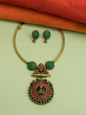 Antique Gold Green Orange Red Circular Lakshmi Pendant Hasli Tube Design Handmade Terracotta Necklace Set