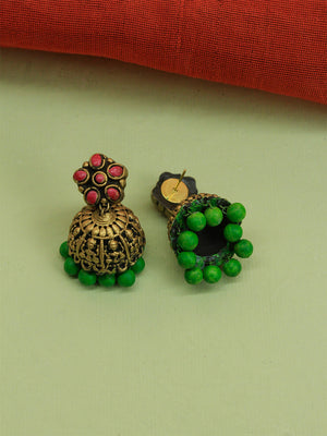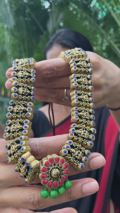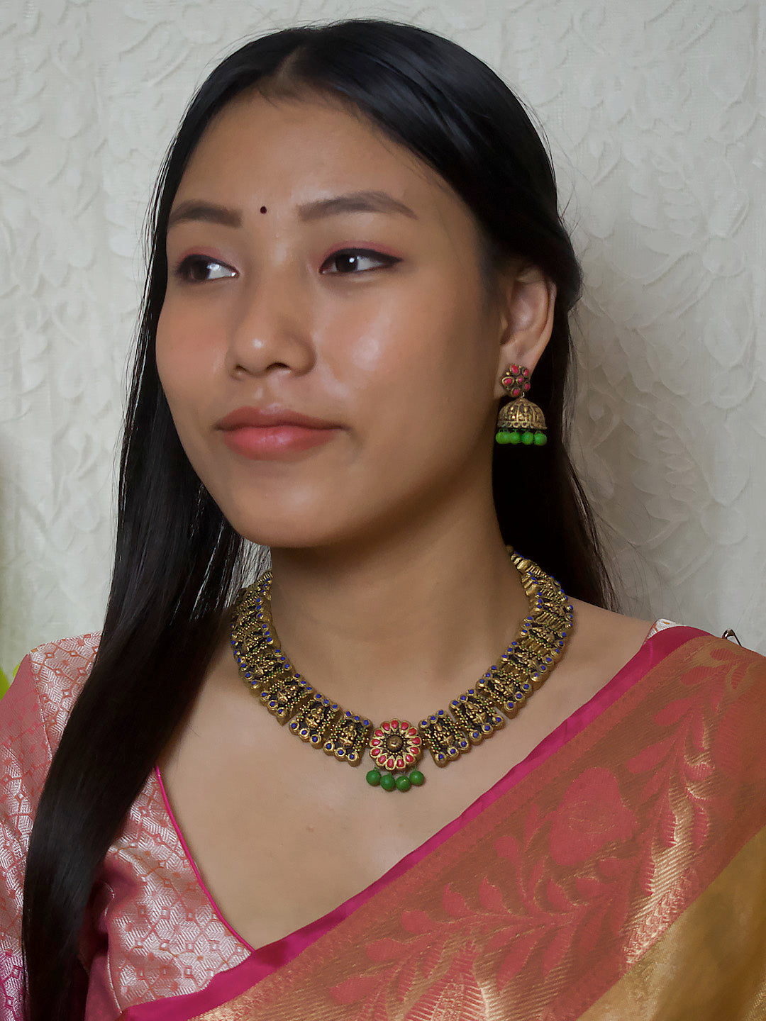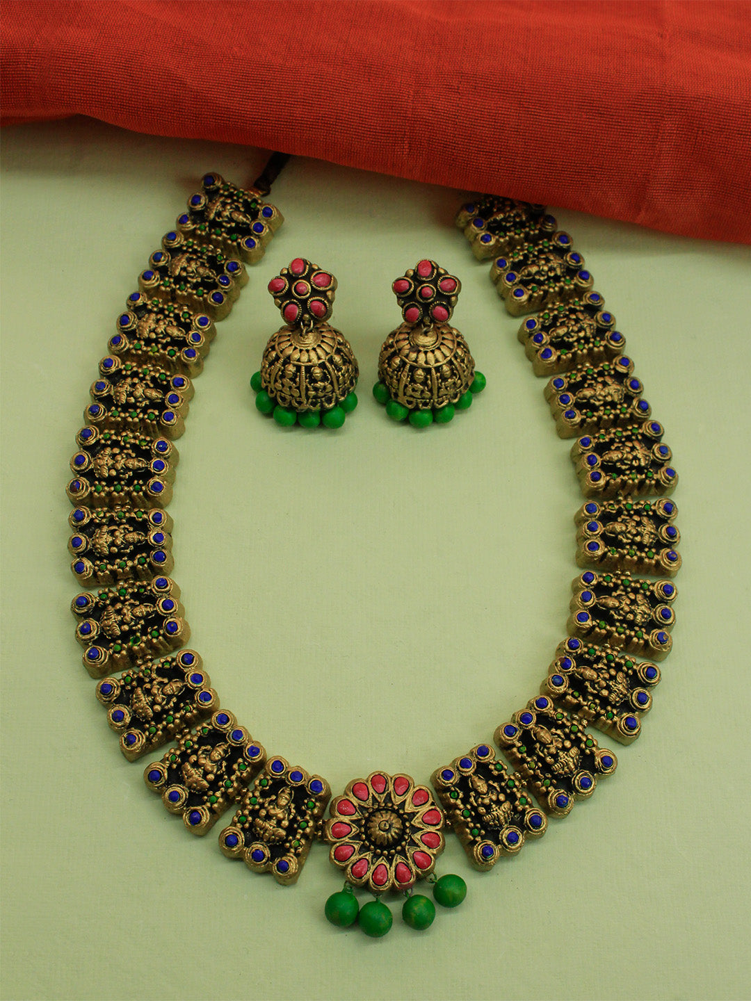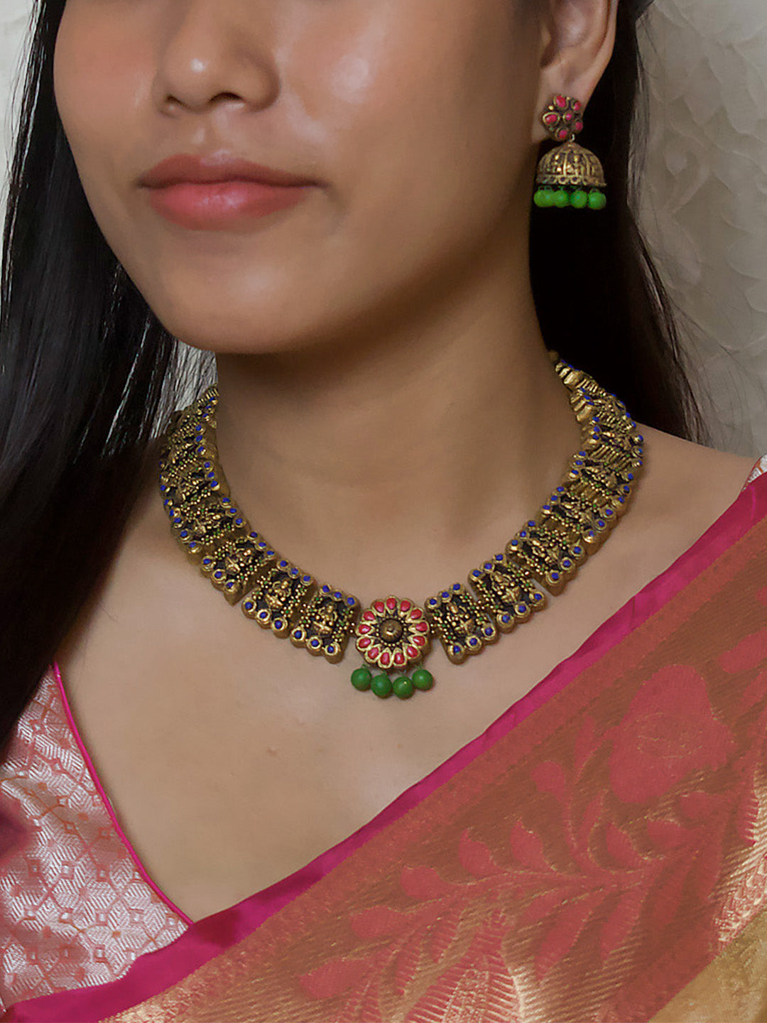 Antique Gold Peach Green Lakshmi Design Handmade Terracotta Necklace Set