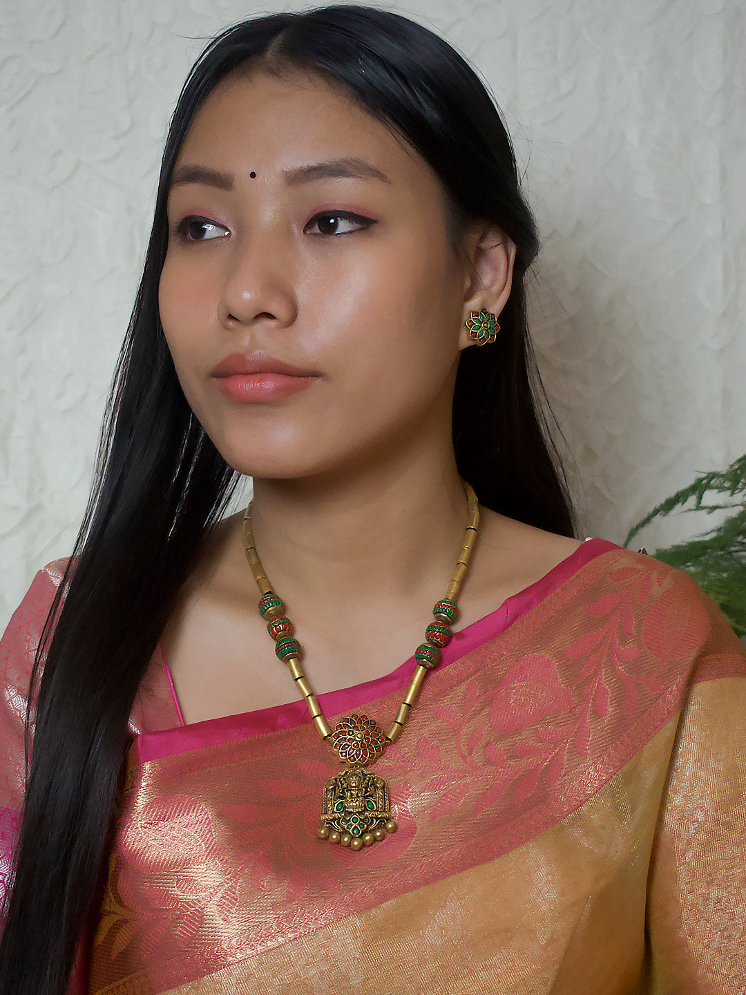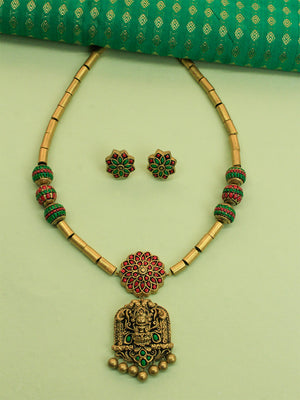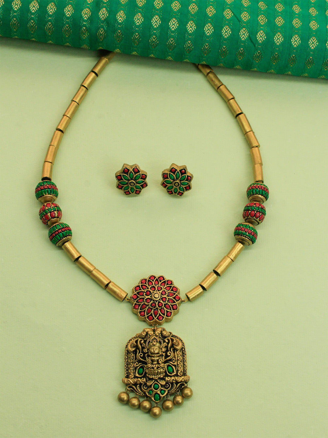 Home Tarangini — Antique Gold Pink Green Mandala Art and Lakshmi Pendant Temple Tube Design Mala Handmade Terracotta Necklace Set