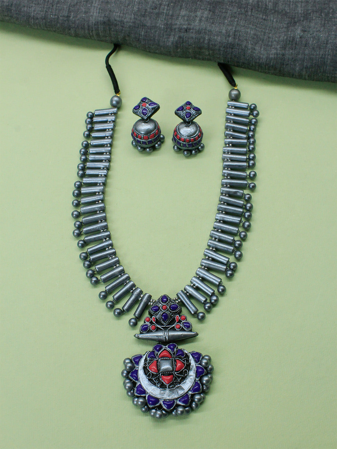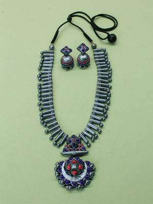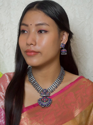 Antique Silver Pink Purple Fringe Pattern Contemporary Style Handmade Terracotta Necklace Set