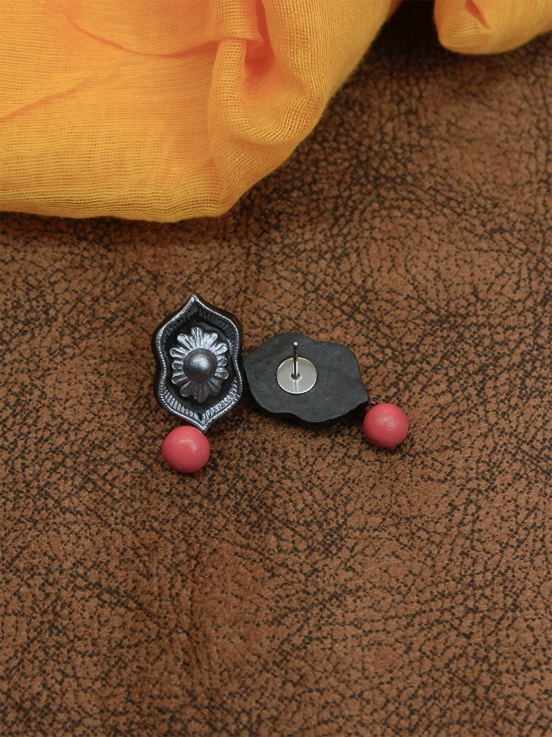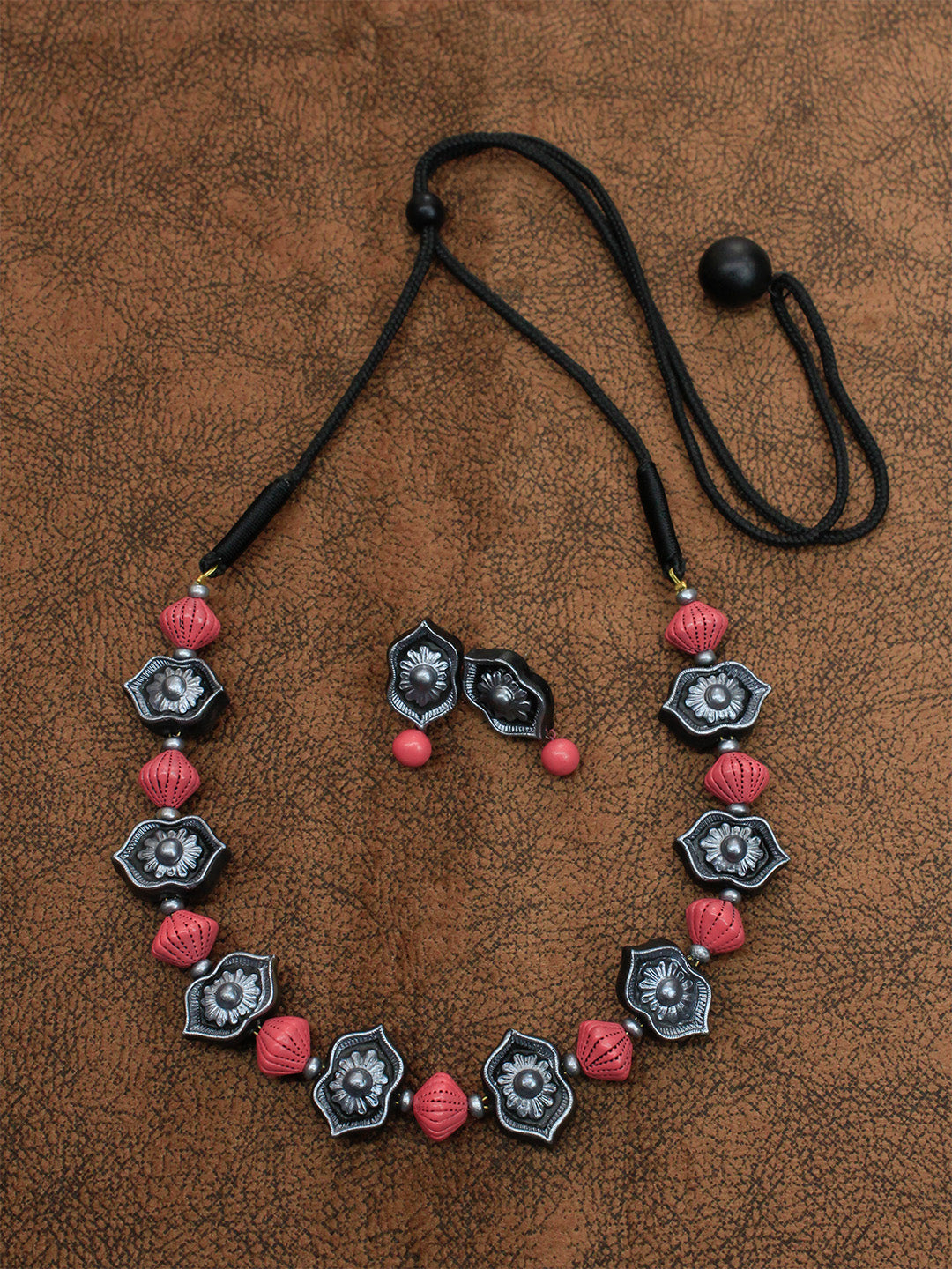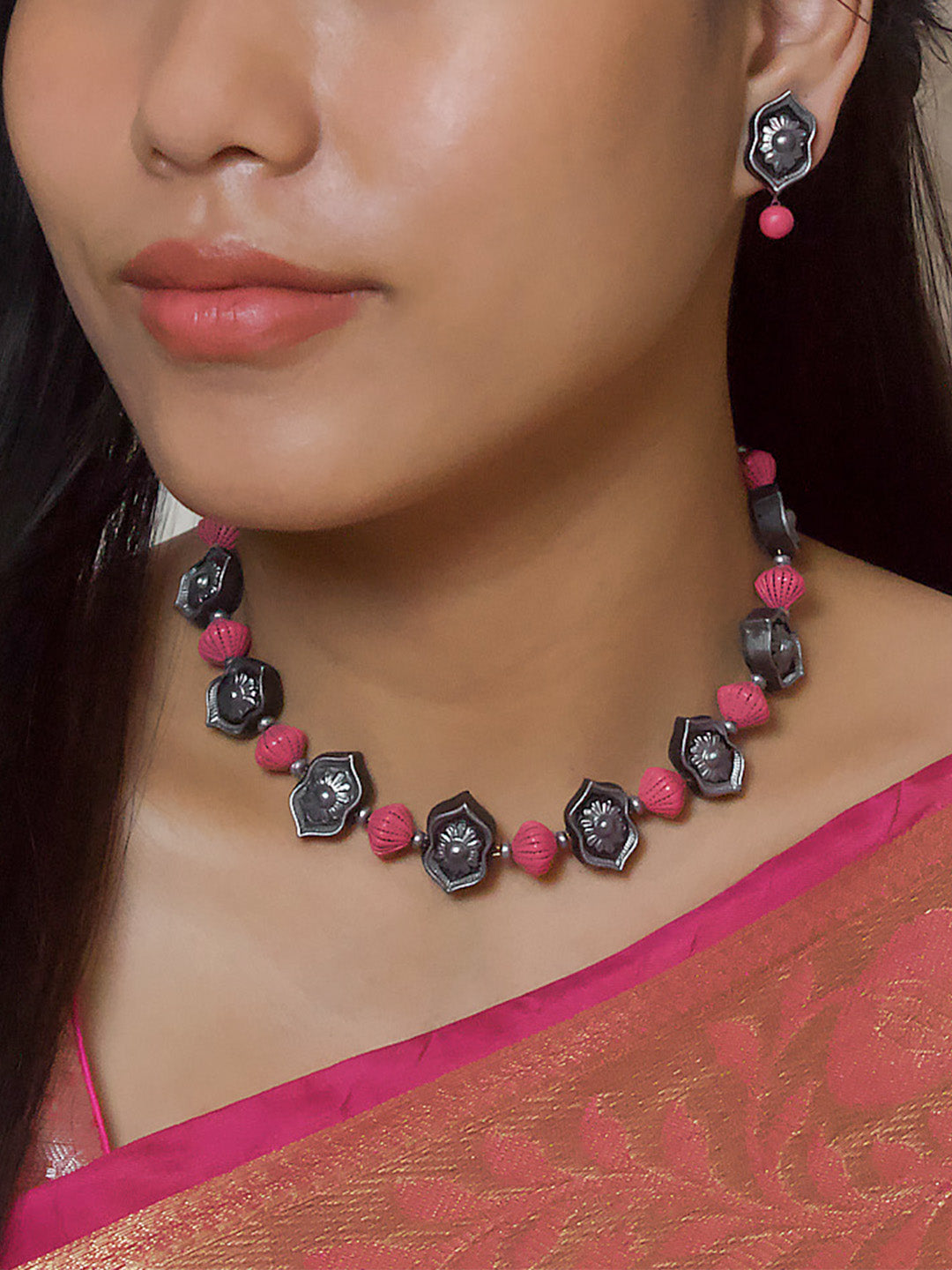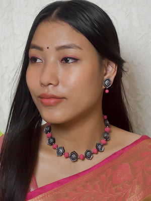 Antique Silver and Peach Colour Minimalistic Mandala Art Work Handmade Terracotta Choker Necklace Set