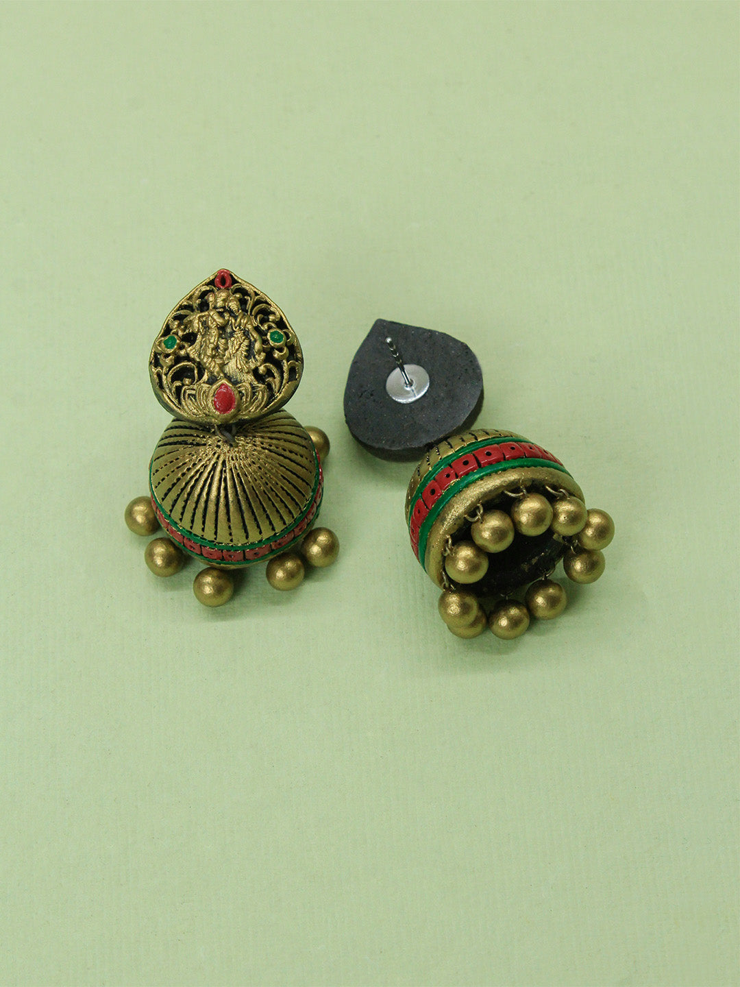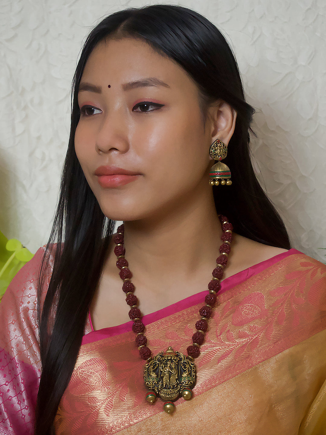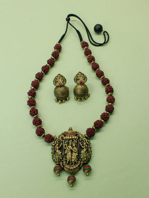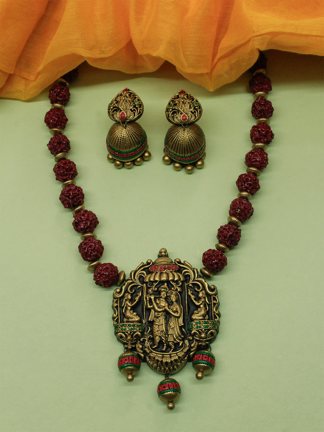 Antique Gold Red Green Orange Maroon Rudraksha Design Radha Krishna Handmade Terracotta Necklace Set
