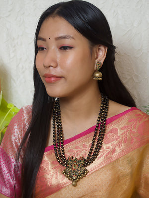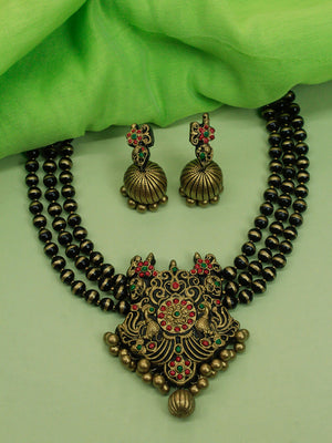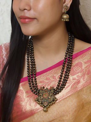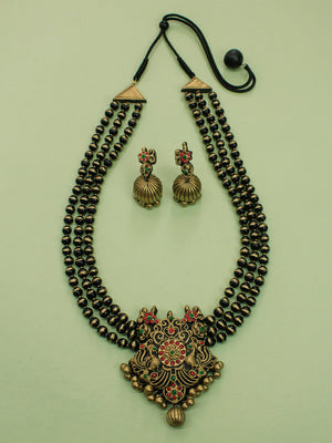 Black Antique Gold Red Green 3 Layered Peacock Design Haram Handmade Terracotta Necklace Set