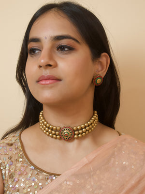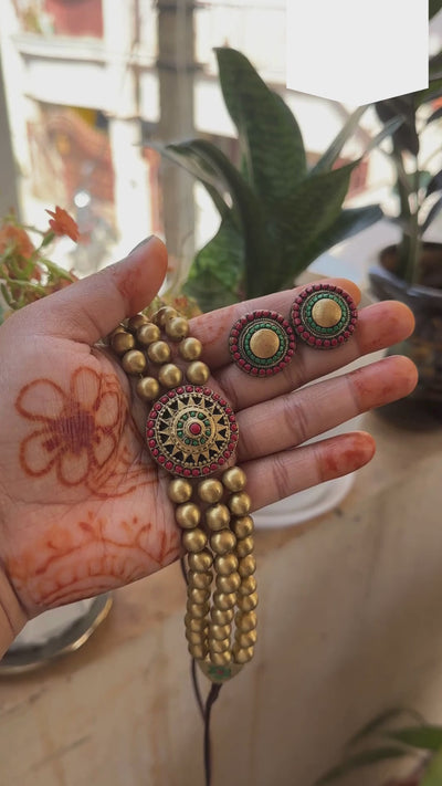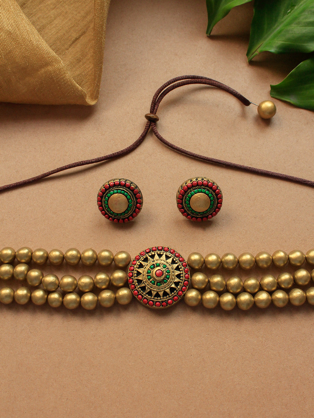 Antique Gold Three line victorian choker surya sun design handmade terracotta necklace set