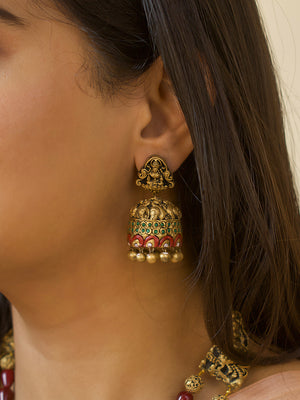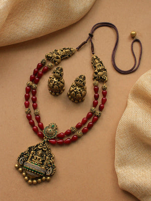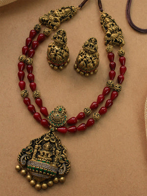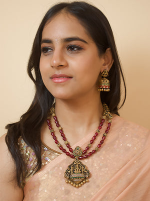Suvarna Manjari — Lakshmi Design 2 layered Maroon Glass Beads Haram Style Antique Gold Handmade Terracotta Necklace Set