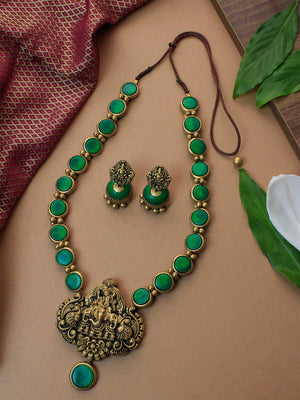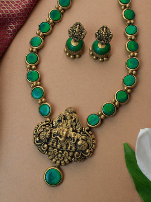 Ganesha Mandala — Green and Antique Gold Circular Pattern Ganesha Pendant Design Temple Long Handmade Terracotta Necklace Set