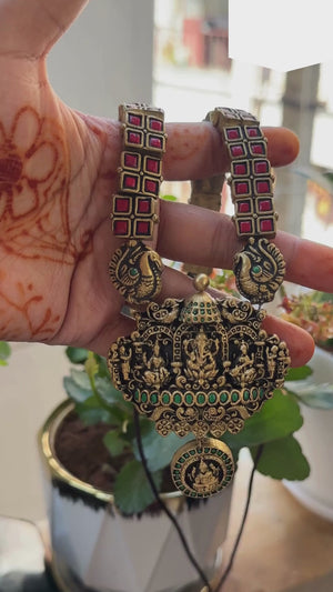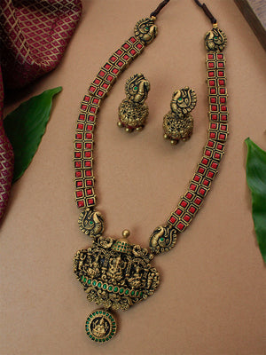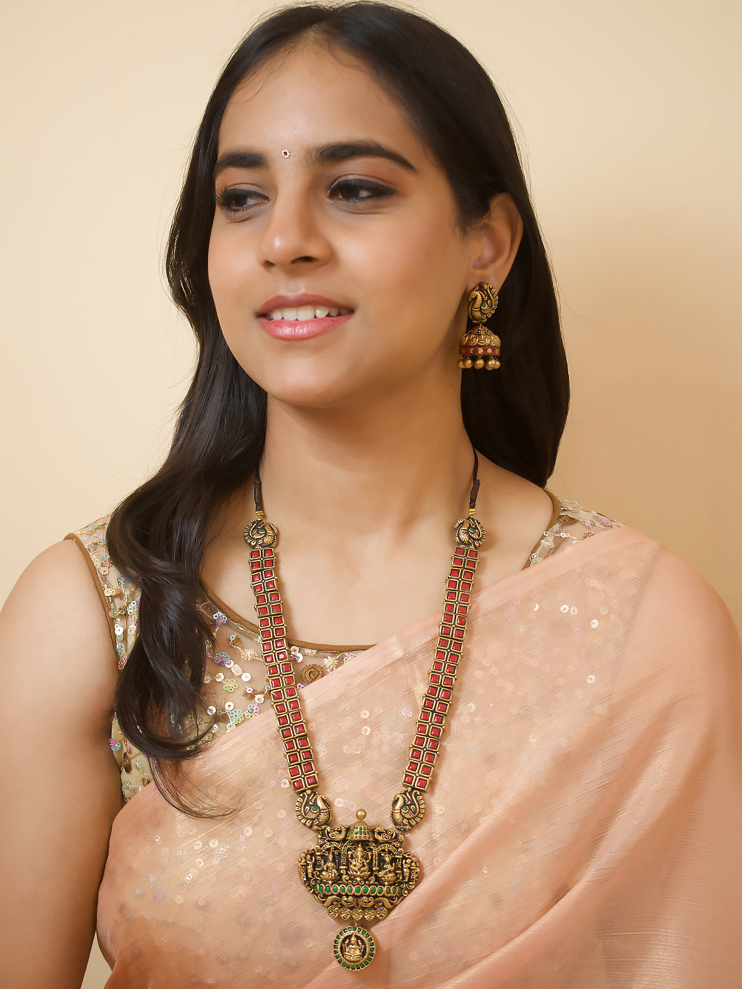 Chitralekha — Antique Gold Red Green Checkered Square Pattern Ganesha Lakshmi and Saraswathi Design Long Haram Temple Handmade Terracotta Necklace Set
