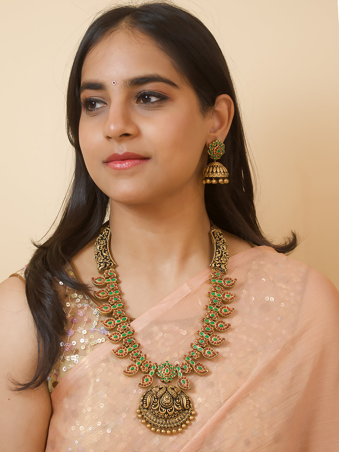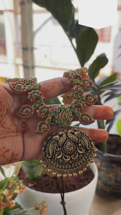 Amrapiccha — Mango Design Peacock Antique Gold Red Green Haram Temple Handmade Terracotta Necklace Set