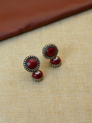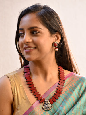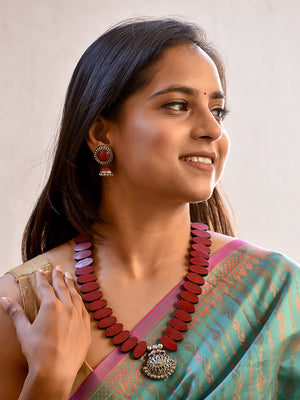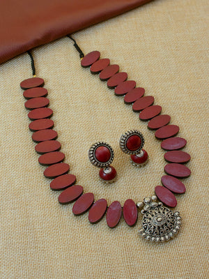 Beautifully Handcrafted Oval Terracotta Jewellery Set in Deep Maroon & Antique Silver