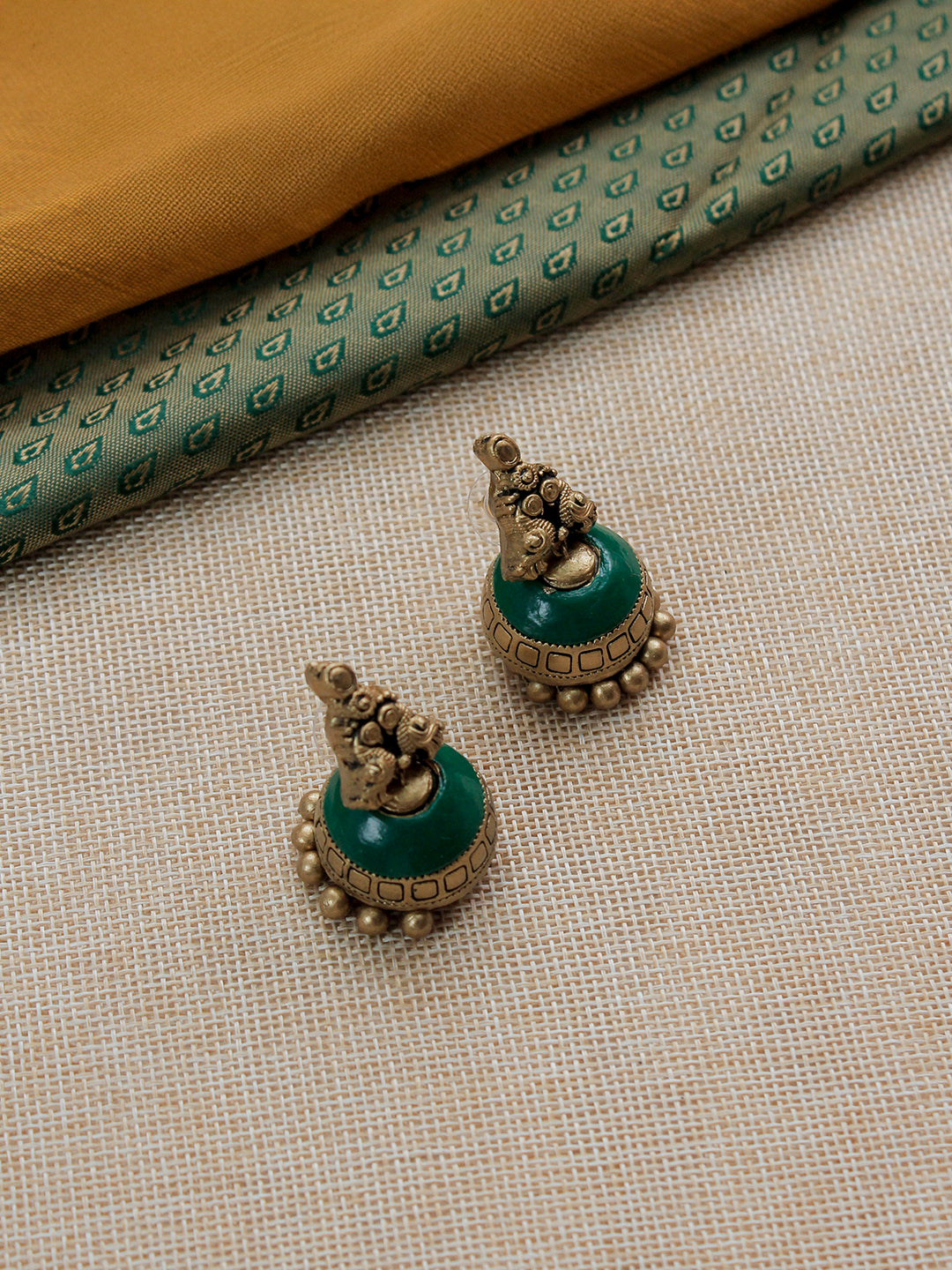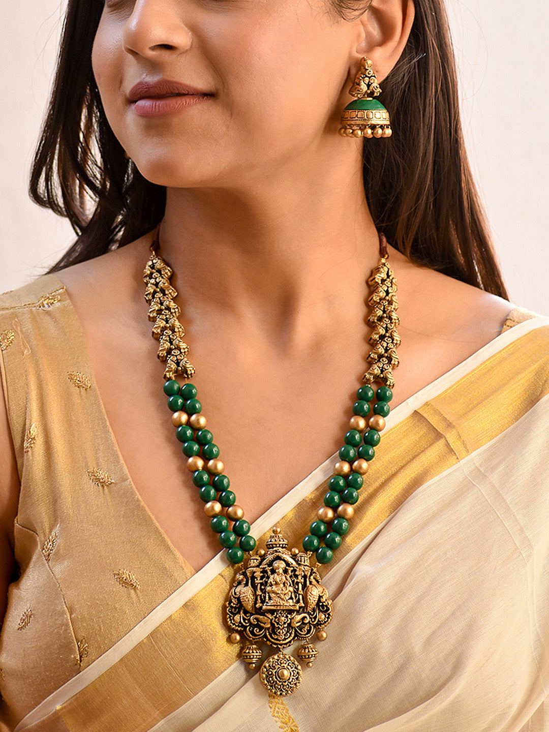 Devashree — Beautifully Handcrafted Temple Two Layer Terracotta Jewellery Set in Emerald Green & Antique Gold"