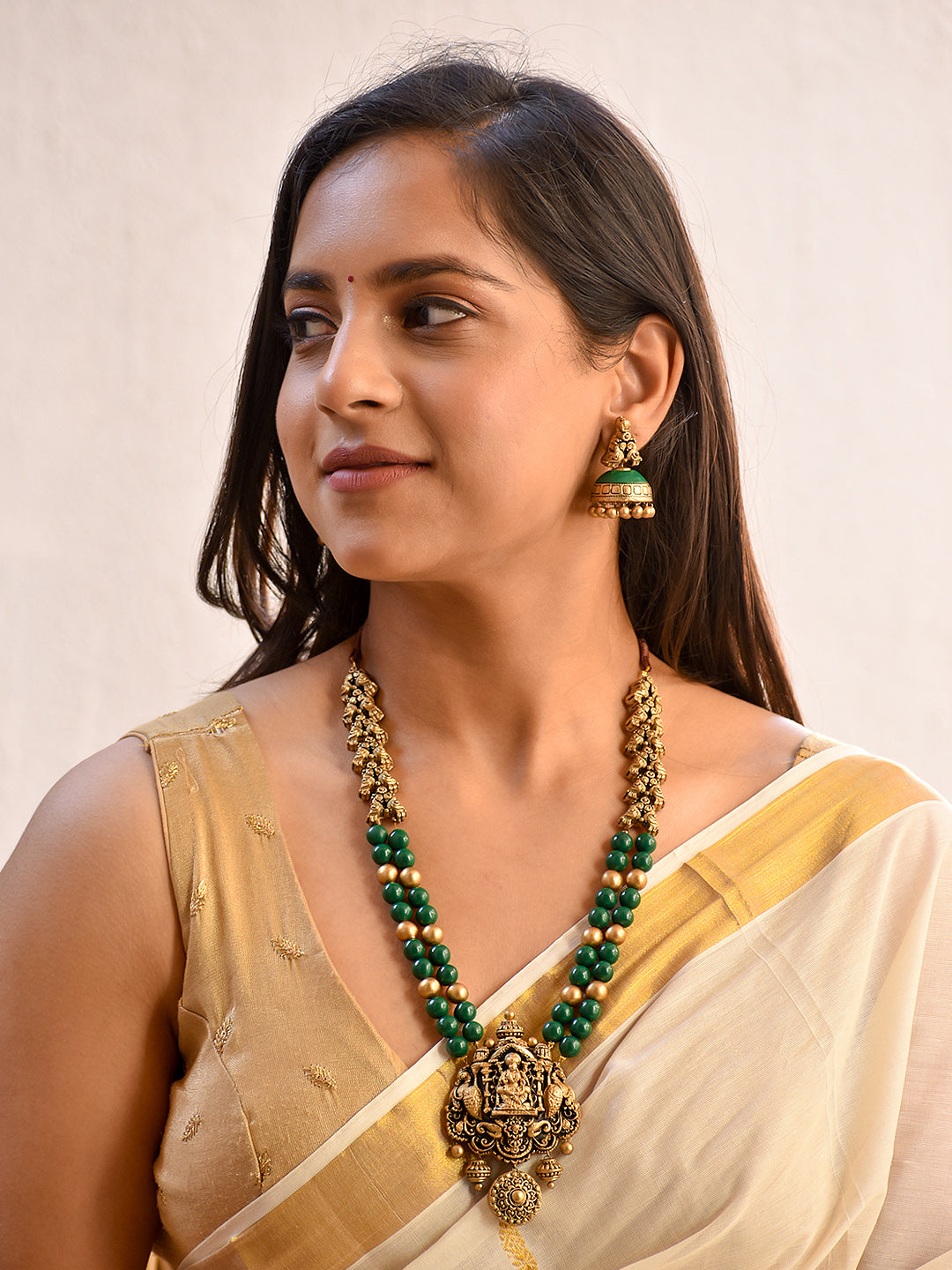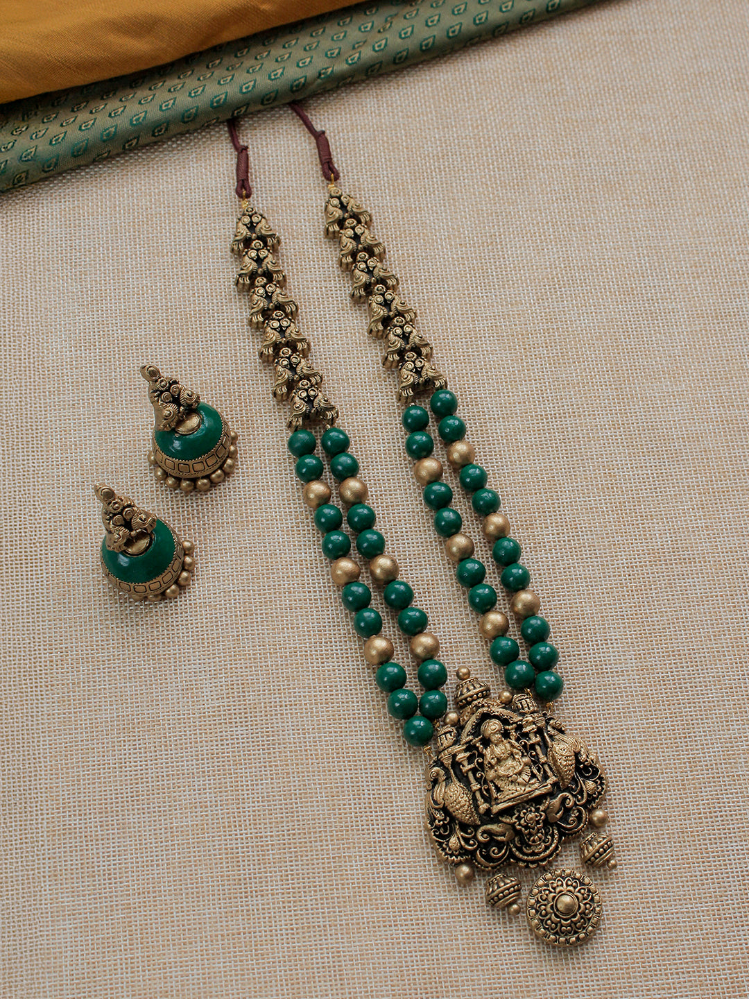 Home Devashree — Beautifully Handcrafted Temple Two Layer Terracotta Jewellery Set in Emerald Green & Antique Gold"