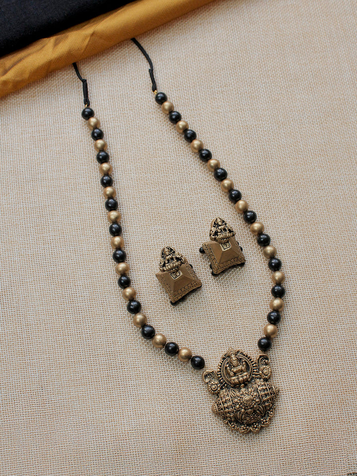 Home Handmade Temple Pendant Terracotta Jewellery Set in Black & Antique Gold Finish